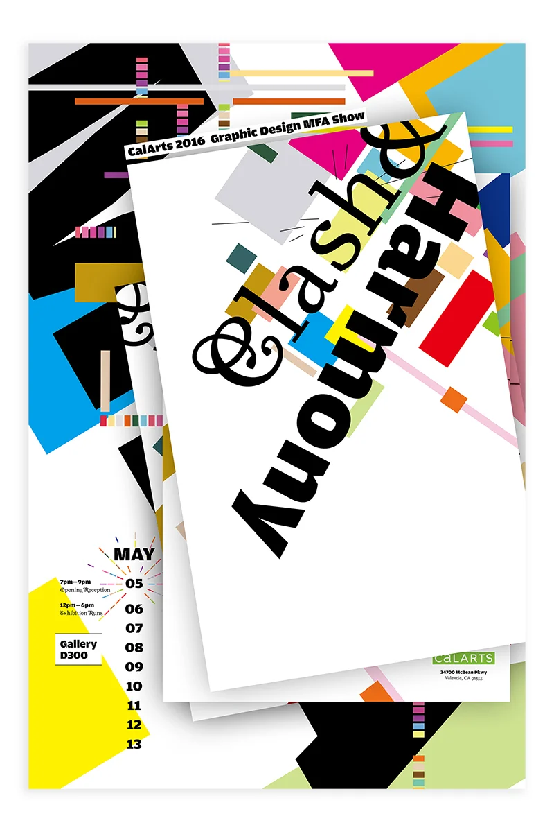 Clash & Harmony investigates what the spectrum of the CalArts Graphic Design MFA community looks like. In an environment that highly encourages the development of one's own point of view, these different hues show a range of formal and conceptual strategies, curatorial approaches, tools and media. This exhibition highlights the designers' personal gazes as well as their hybridized encounters, each a particular response to the question of how graphic design could exist today.