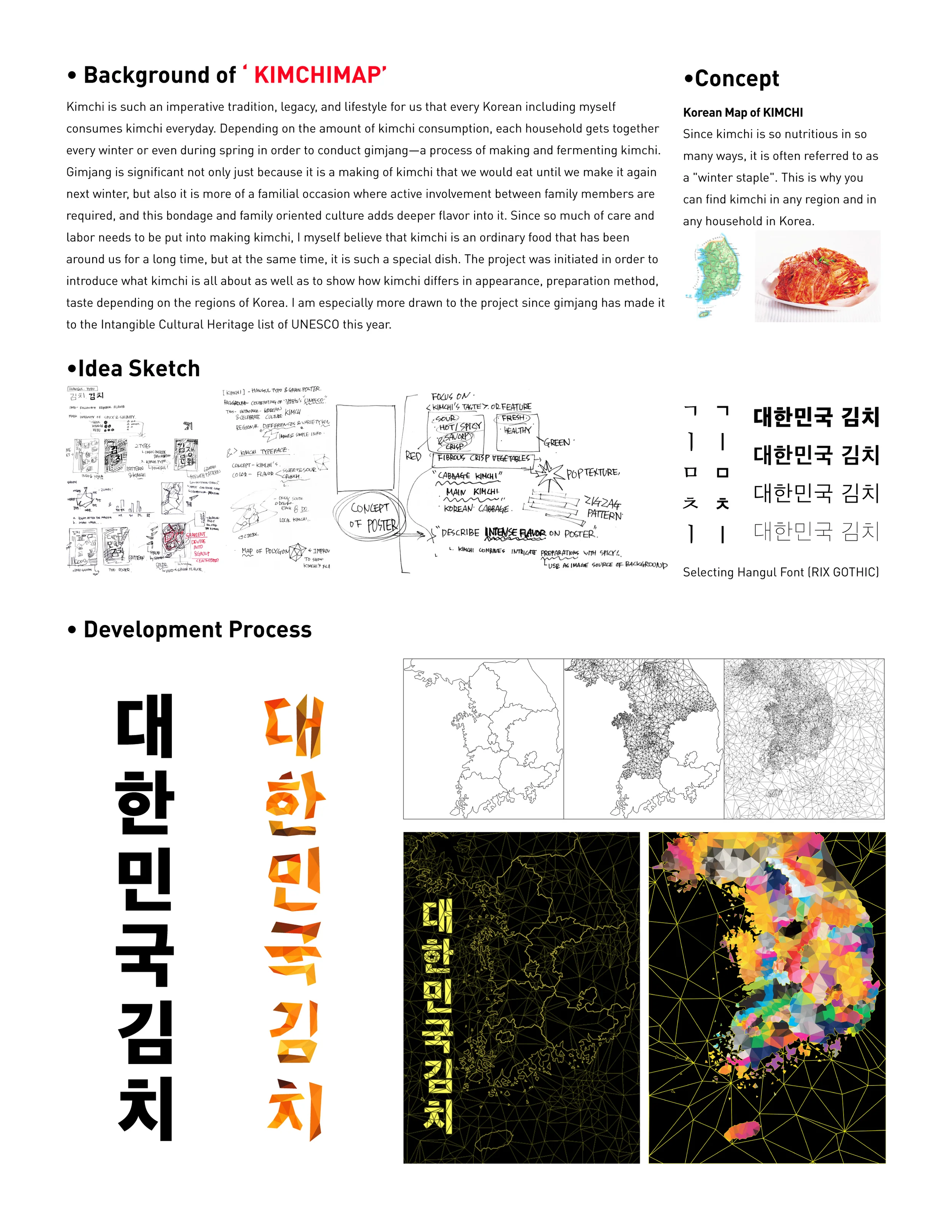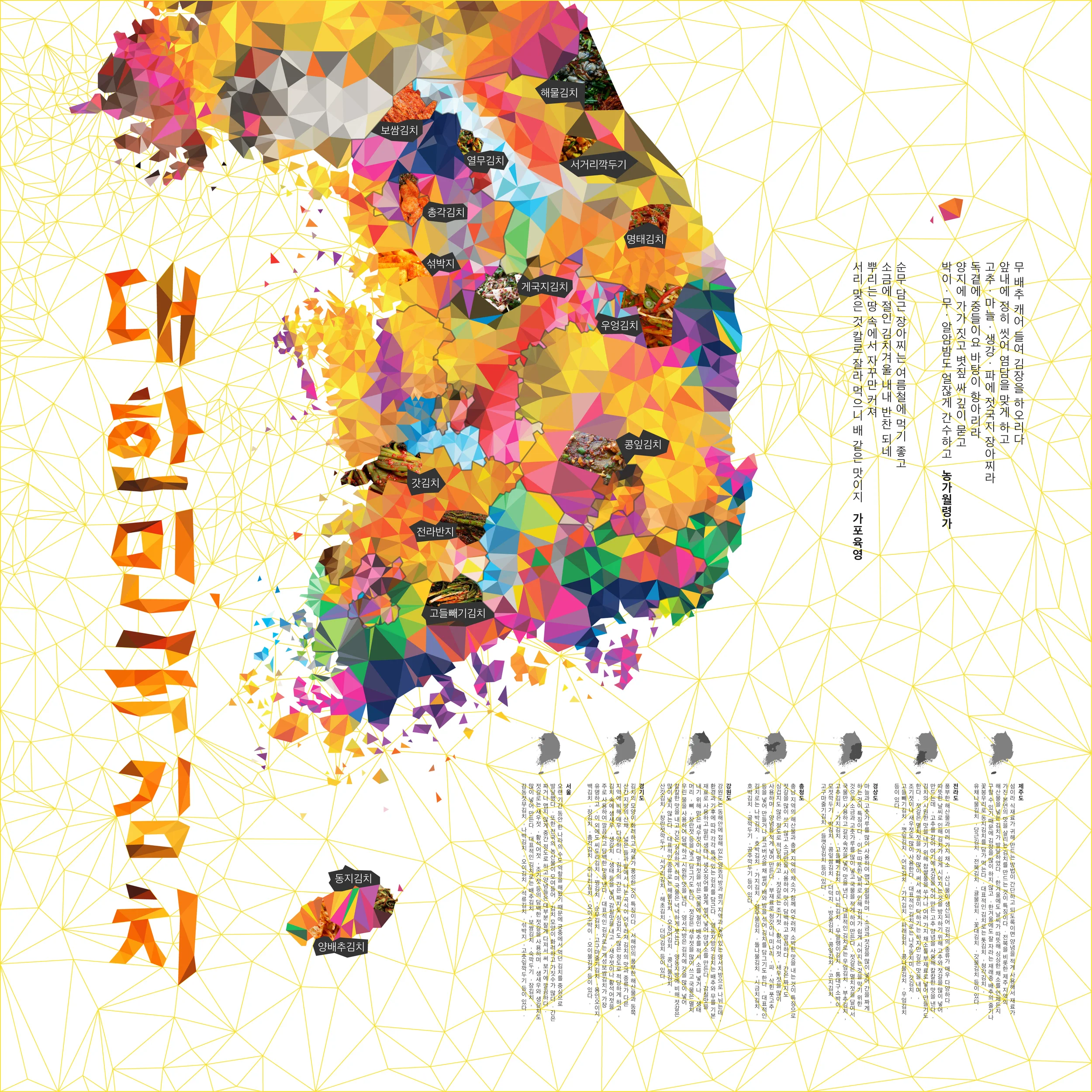 My intention was to introduce various types of kimchi depending on geographical aspect in a new and impressive way. I interpreted the artwork through using map in order to make it look tidy and organized as well as to grab the viewers’ attentions easily.
